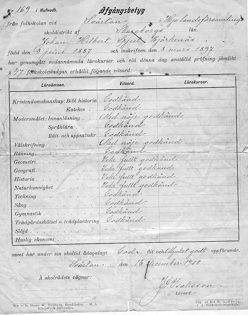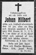 Han inflyttade till Östersund 18/11 1909 och träffade så småningom Hilma som arbetade där som tjänarinna. Johan Hilbert emigrerade 1911 utan att ta ut flyttningsattest till Amerika tillsammans med alla då levande syskon utom Arvid. Han står som "obefintlig" i kyrkböckerna ända till 1940-talet. En vanlig resväg på den här tiden var "Calypso" som avgick från Göteborg och gick till England. Kanske åkte han med Titanics systerfartyg Olympic som blev klar 1910. (Titanic förliste 14 april 1912.) Han avled på Rosary Hill Home i New York som var (och är) ett behandlingshem för obotligt sjuka cancerpatienter. |