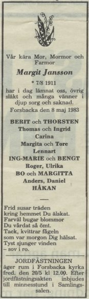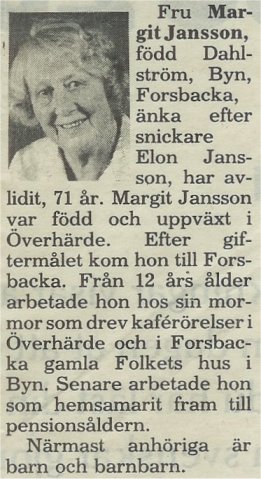 Margit föddes på Storgatan 26 i Forsbacka.