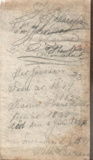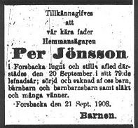 Pehr Jönsson son till Jöns Persson f 30/9 1829 i Valbo(X) Vigd Döpt vid 29 års ålder Död 20/9 1908 av ålderdomssvaghet |